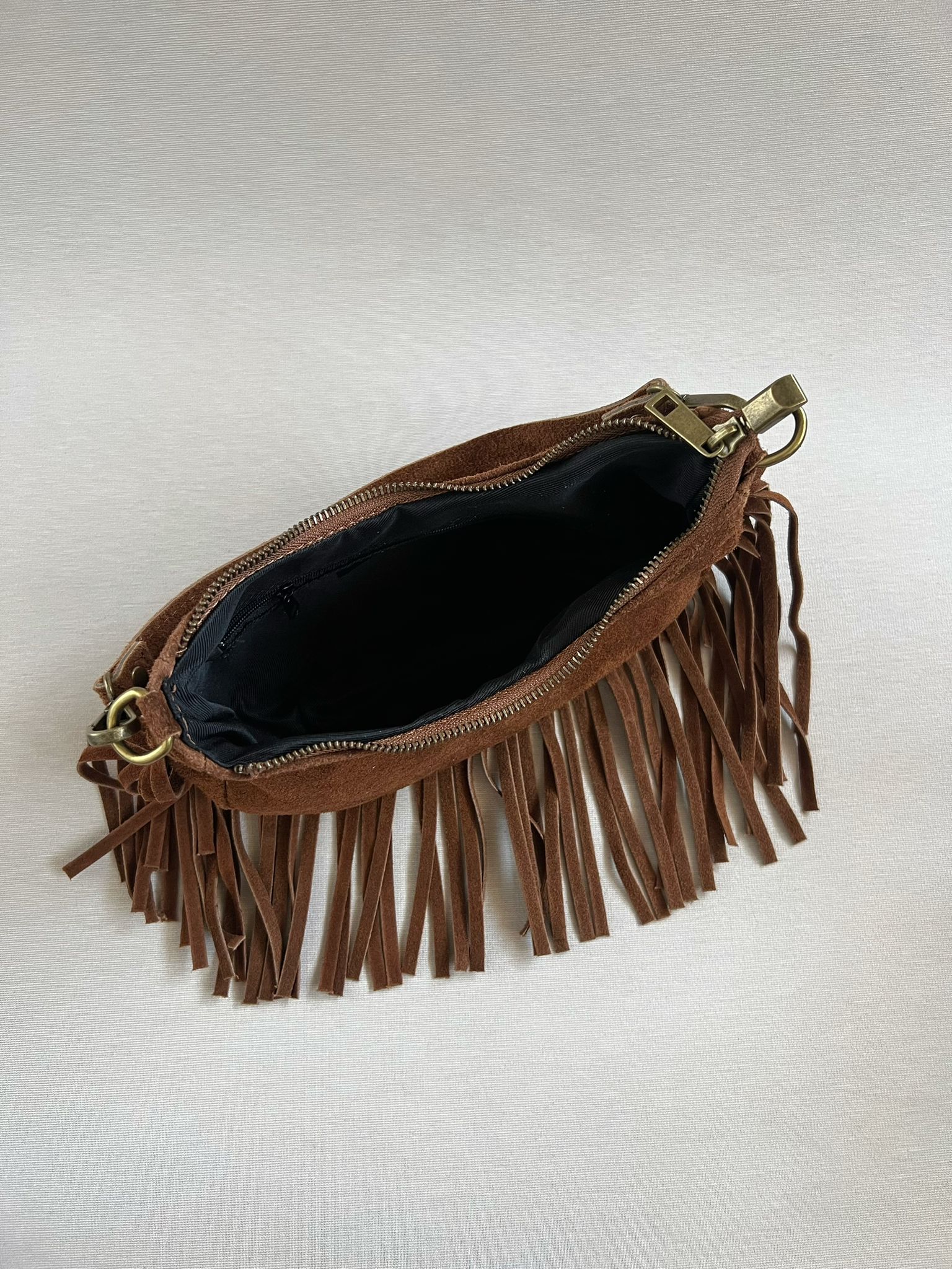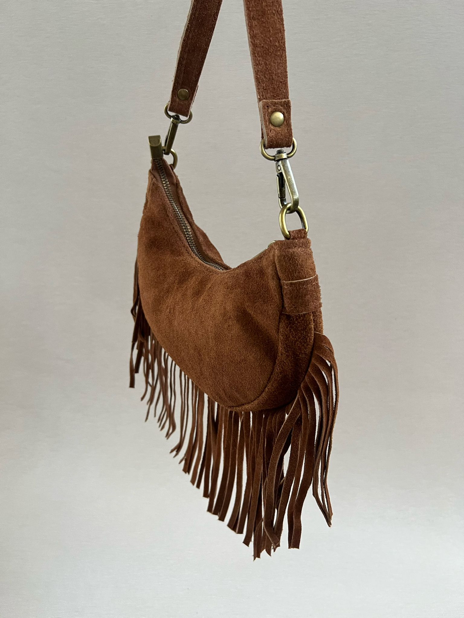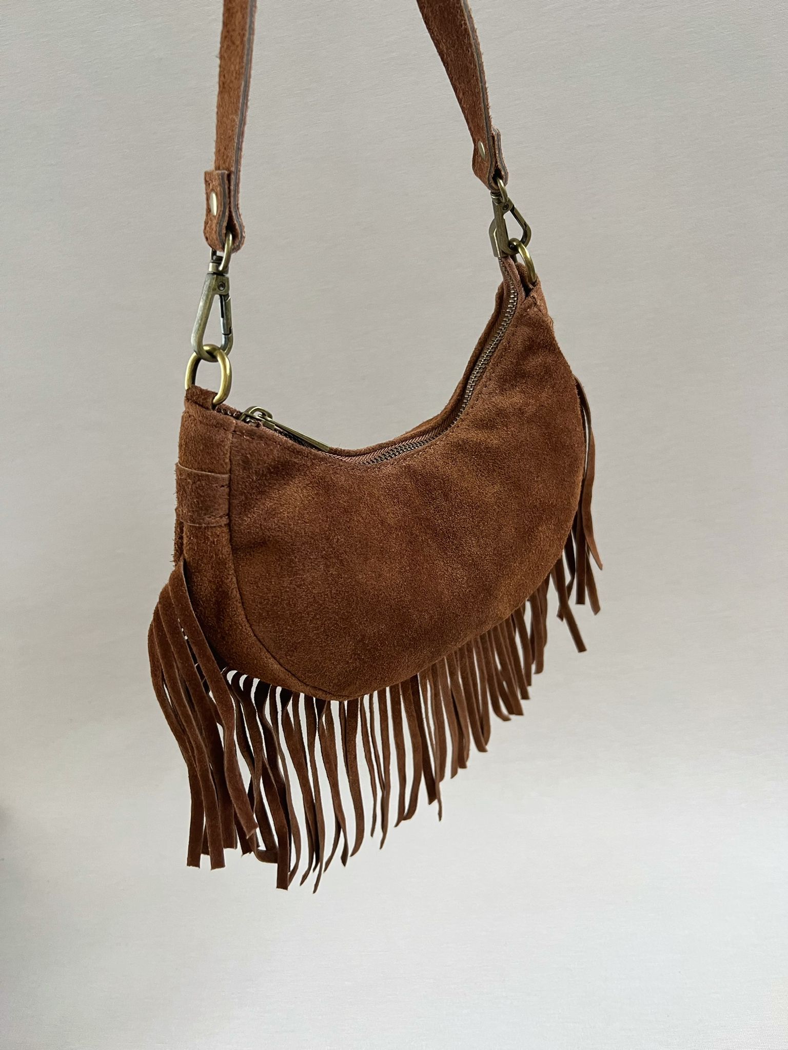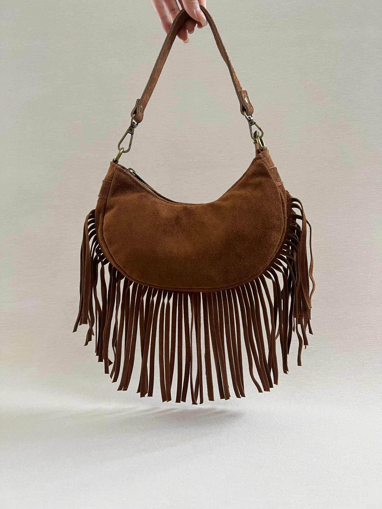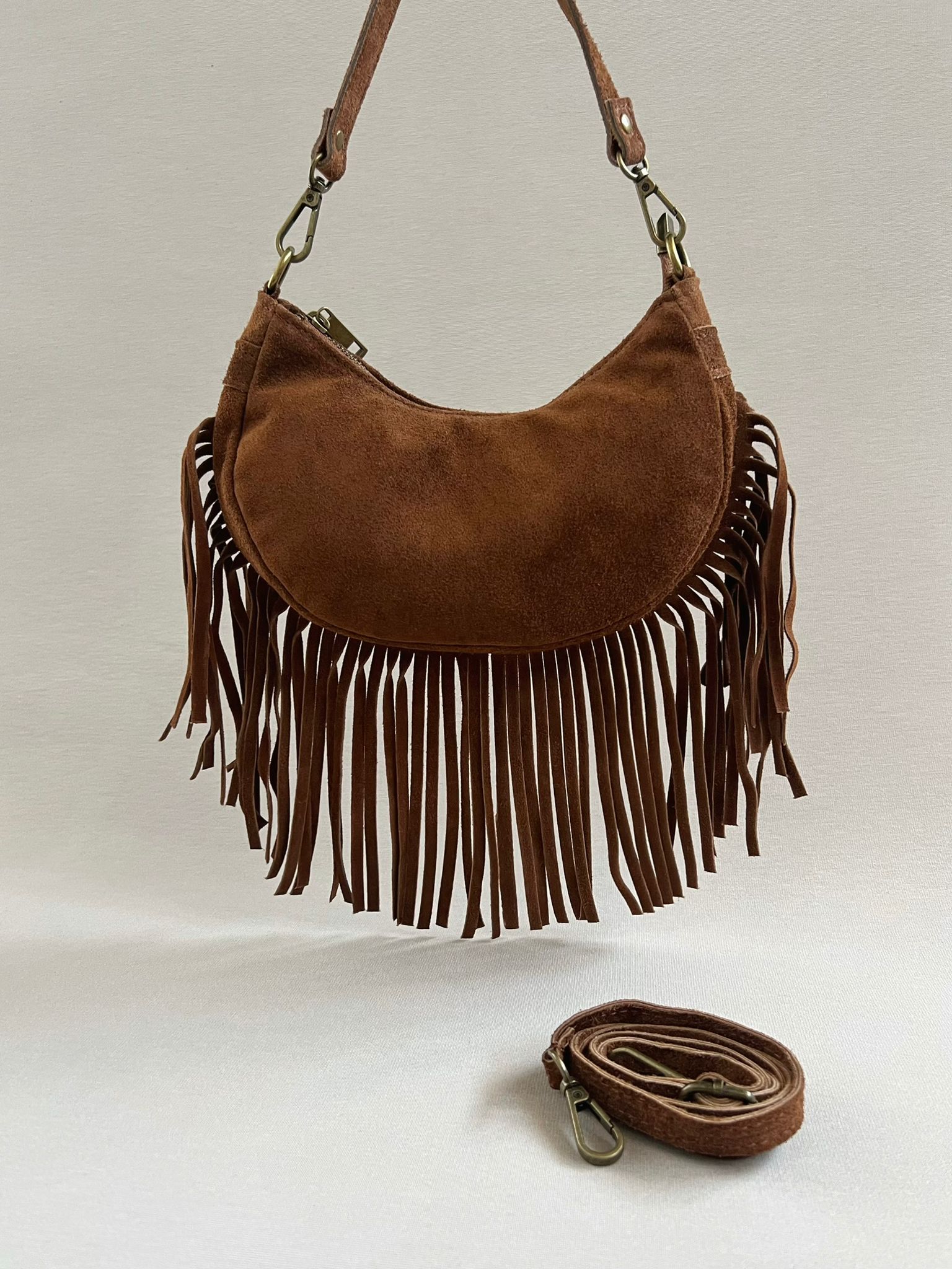 Borsa mezzaluna a spalla con frange, con tracolla regolabile e rimovibile compresa.